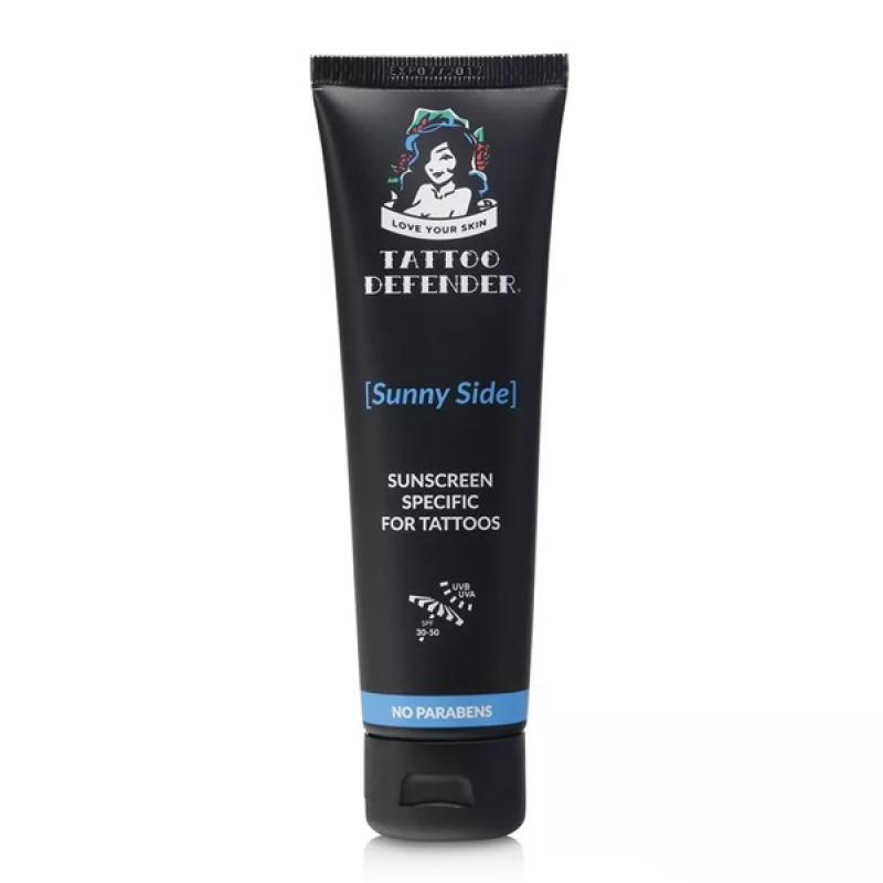 (Toujours vérifier que l’écran solaire que vous appliquez sur votre tatouage ne contient pas d’oxyde de zinc ou de titane ni de parabène.)