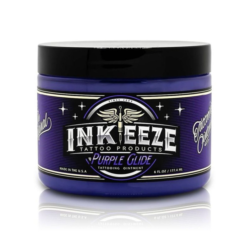 Le Purple Glide est un baume spécialement formulé sans pétrole, à base d'huiles essentielles. Sa formule a été développée en collaboration avec des tatoueurs et des dermatologues afin de garantir une lubrification optimale pendant le processus de tatouage, ainsi qu'un soin efficace après celui-ci. Il est disponible en sachets individuels ou en pot pour plus de praticité.