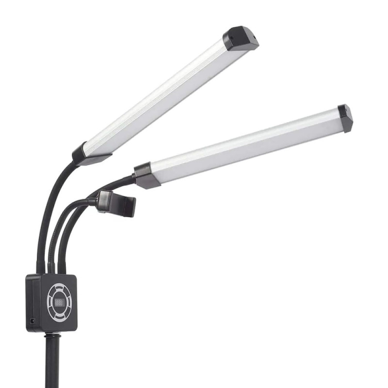 Lampe LED sur pied avecdeux bras articuléspour un éclairage précis, équipée d’unsupport smartphone. Intensité lumineuse réglable partélécommandeet pied en acier pour une stabilité optimale.