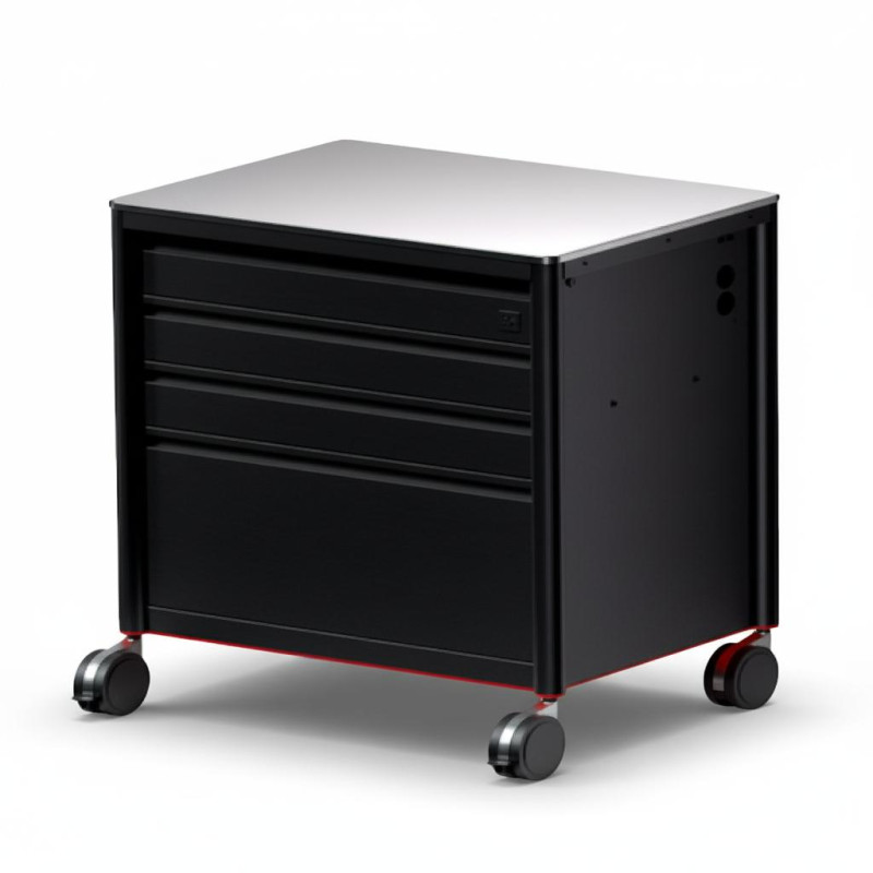 Desserte noire Meta à roulettes avec 4 tiroirs, prises de courant et USB. Mobilité, résistance et fonctionnalité pour les tatoueurs et perceurs exigeants.