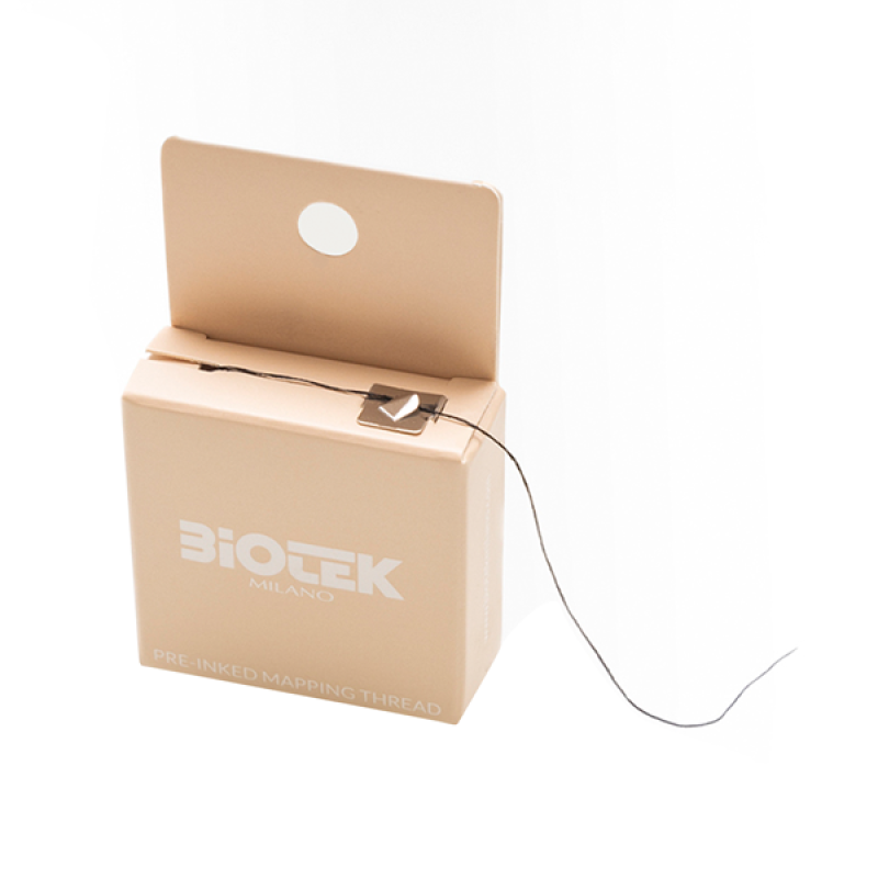 Le fil fin et souple de ce modèle est imbibé d’un pigment blanc qui permet de marquer légèrement la peau sans causer d’inconfort. Une fois l’application faite, les lignes servent de guide pour réaliser maquillage.